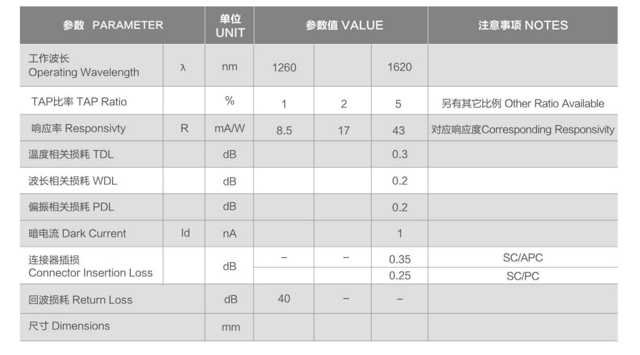 雙芯尾纖式結(jié)構(gòu),實(shí)現(xiàn)一定比例的光透射到探測(cè)器,其余的光反射到另一根光纖。用于WDM網(wǎng)絡(luò)監(jiān)控、光纖放大器、光開關(guān)等。