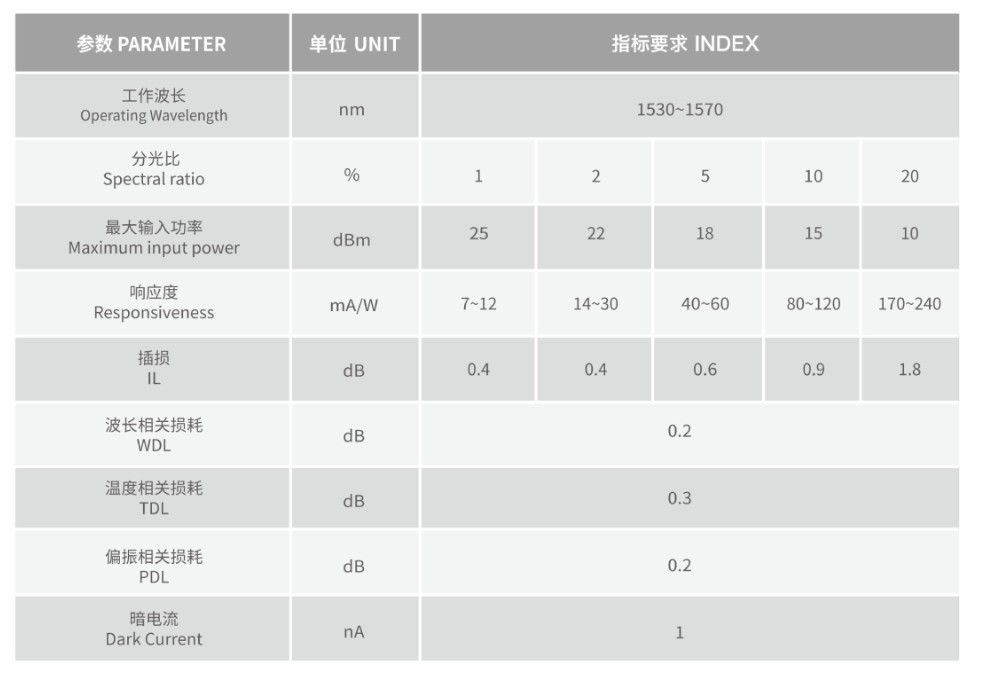 雙芯尾纖式結(jié)構(gòu),實(shí)現(xiàn)一定比例的光透射到探測(cè)器,其余的光反射到另一根光纖。用于WDM網(wǎng)絡(luò)監(jiān)控、光纖放大器、光開(kāi)關(guān)等。